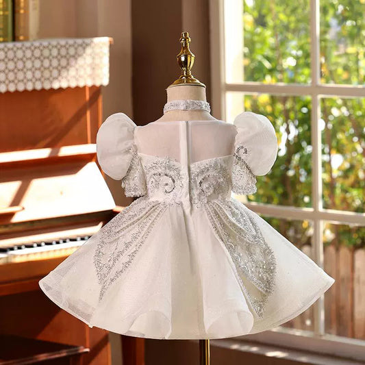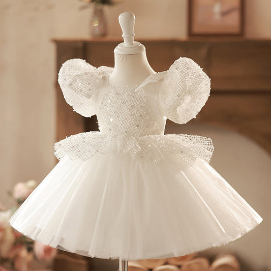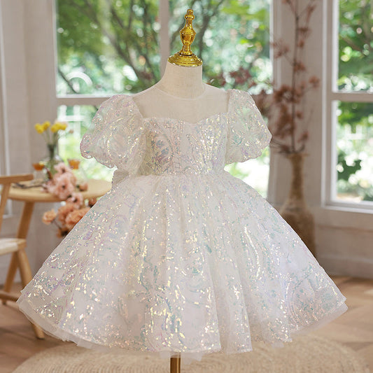 فستان الأميرة الأبيض المزين بالترتر للفتيات الصغيرات برقبة دائرية وركبة منتفخة