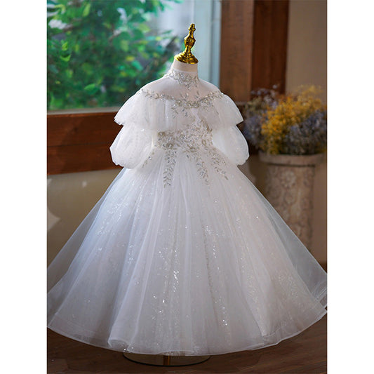 فستان الأميرة للفتيات الصغيرات من التول والترتر باللون الأبيض مع فتحة رقبة عالية