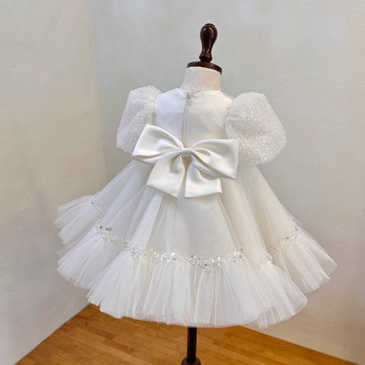 فستان الأميرة للفتيات الصغيرات من التول والترتر باللون الأبيض بأكمام منتفخة وعقدة