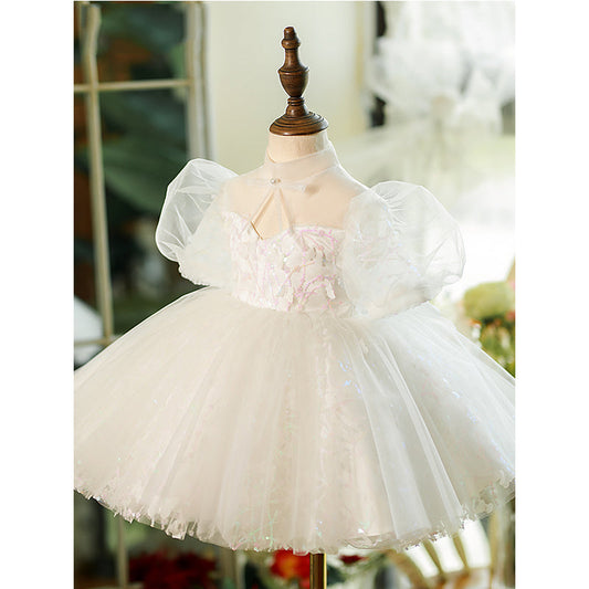 فستان الأميرة للفتيات الصغيرات من التول والترتر الأبيض بأكمام منتفخة