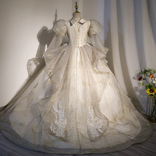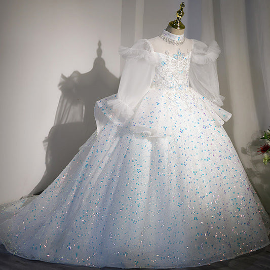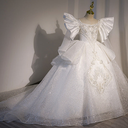 فستان الأميرة الأبيض المزين بالترتر للفتيات الصغيرات - أكمام طويلة منفوخة