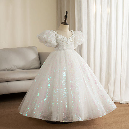 فستان أبيض مطرز بالترتر على شكل حرف A للفتيات الصغيرات بأكمام منفوخة