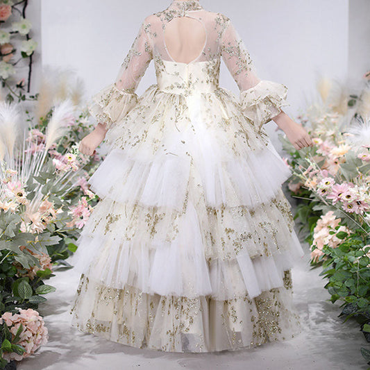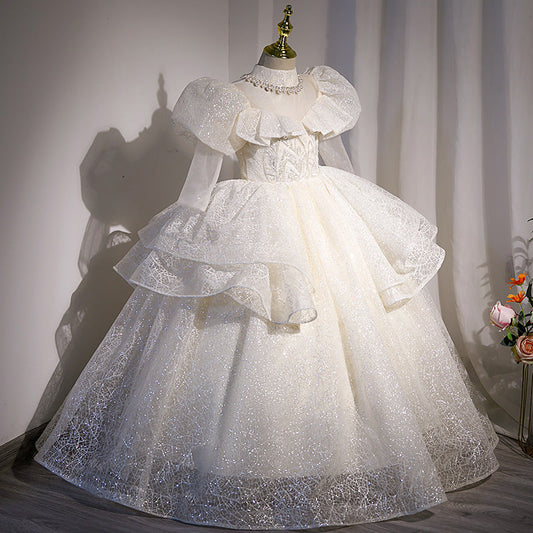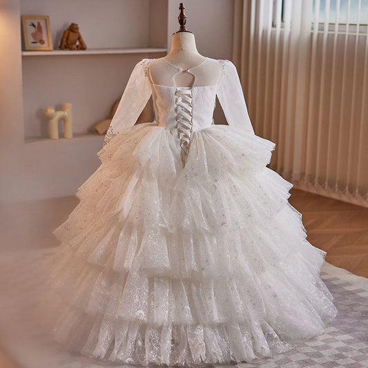 فستان الأميرة الأبيض المزين بالترتر بأكمام طويلة للفتيات الصغيرات مع تنورة متعددة الطبقات