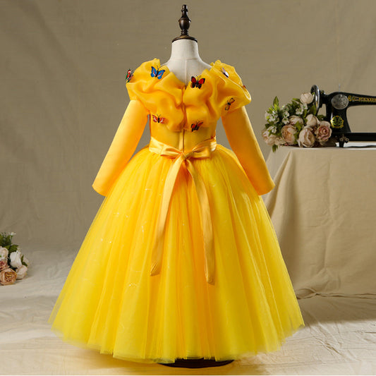 فستان فتاة الزهور من التول الساتان الأصفر بتصميم حرف A وأكمام طويلة وأرضية