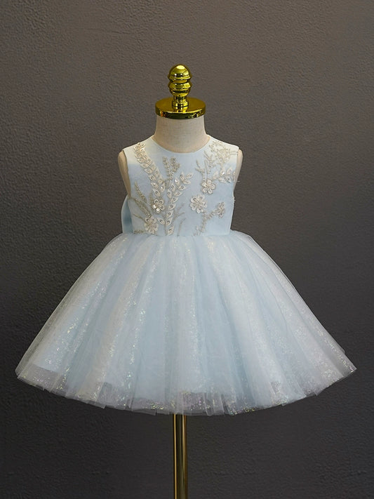 فستان الأميرة الدائري الطويل المزين بالترتر للفتيات الصغيرات باللون الأزرق الباهت