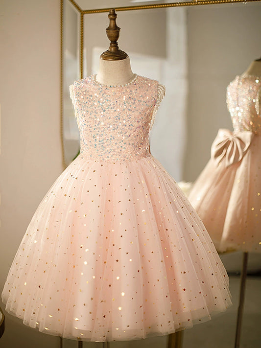فستان أميرة مستدير بطول الأرض مزين بالترتر للفتيات الصغيرات باللون الشمبانيا