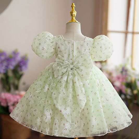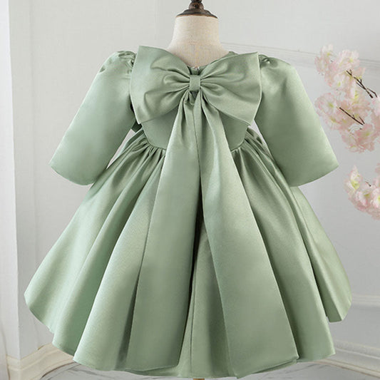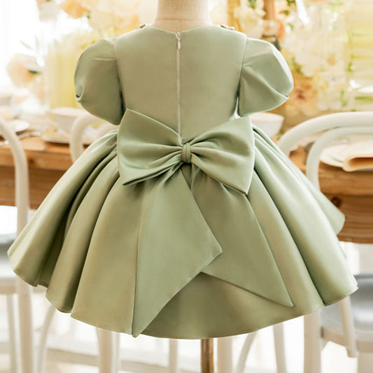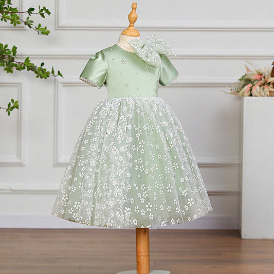 فستان أميرة من التول الساتان باللون الأخضر الفاتح للفتيات الصغيرات مع فيونكة من الخرز