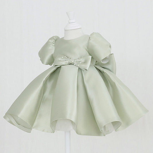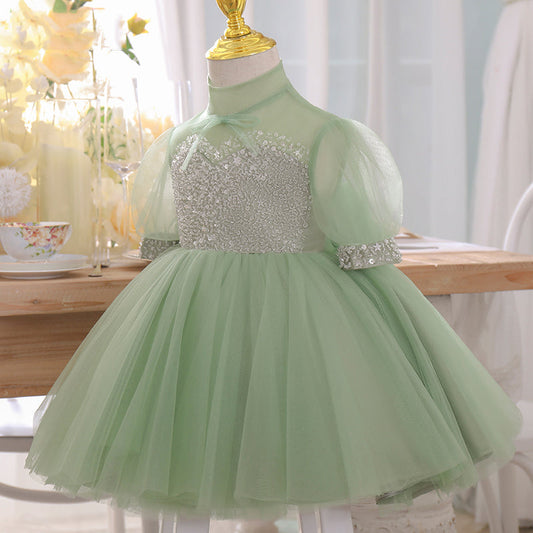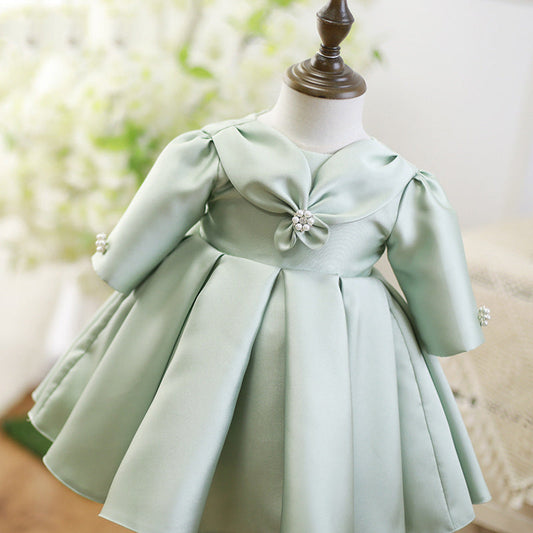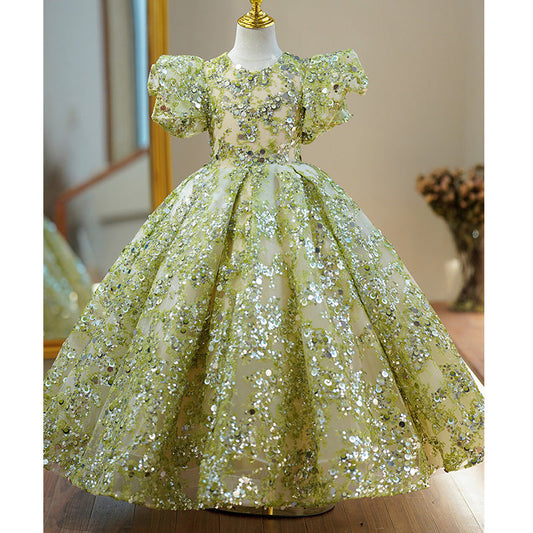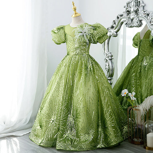 فستان أميرة من الساتان باللون الأخضر الفاتح للفتيات الصغيرات بأكمام منتفخة ومزين بالخرز