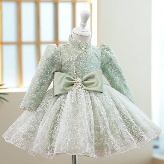 فستان فتاة الزهور من الدانتيل باللون الأخضر الفاتح، بفتحة رقبة عالية وأكمام طويلة