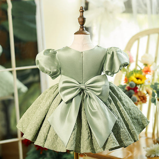 فستان أميرة فتاة الزهور باللون الأخضر المريمية بأكمام منفوخة وأقواس