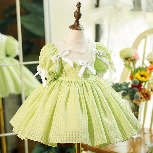 فستان أميرة من الدانتيل الساتان باللون الأخضر الفاتح بأكمام قصيرة للفتيات الصغيرات