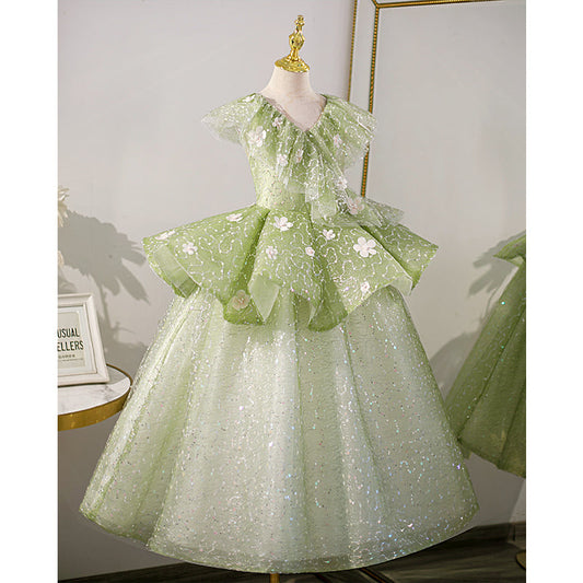 فستان أميرة من الدانتيل باللون الأخضر الفاتح للفتيات الصغيرات، مزين بالخرز وفتحة رقبة على شكل قارب
