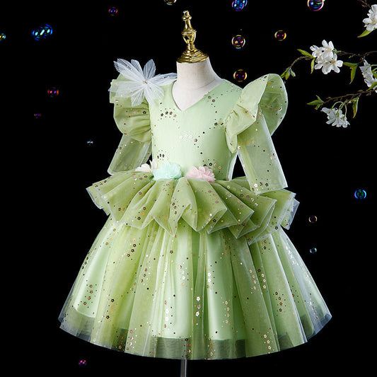 فستان أميرة من الدانتيل الساتان باللون الأخضر الفاتح بأكمام منتفخة للفتيات الصغيرات