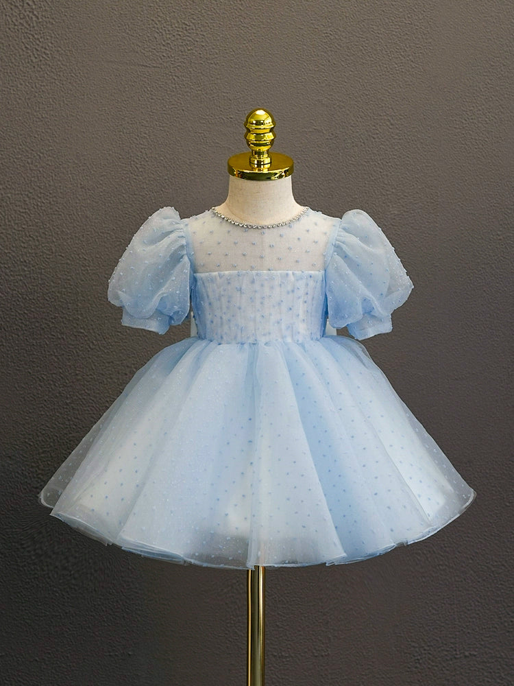 فستان الأميرة لفتاة الزهور باللون الأزرق مع أكمام منتفخة مرصعة بالخرز