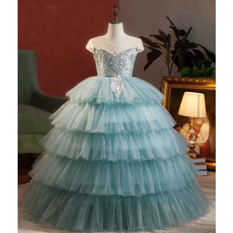 فستان الأميرة الطويل من التول للفتيات الصغيرات باللون الأزرق مصمم بخبرة لأي مناسبة خاصة، مصنوع من قماش التول عالي الجودة ويتميز بأشرطة متقاطعة مذهلة وزخارف معقدة من الدانتيل والخرز. تجعل الصورة الظلية للأميرات والطول الطويل وفتحة العنق الواسعة هذا الفستان مثاليًا لحفلات التعميد وأعياد الميلاد والزفاف والمزيد.