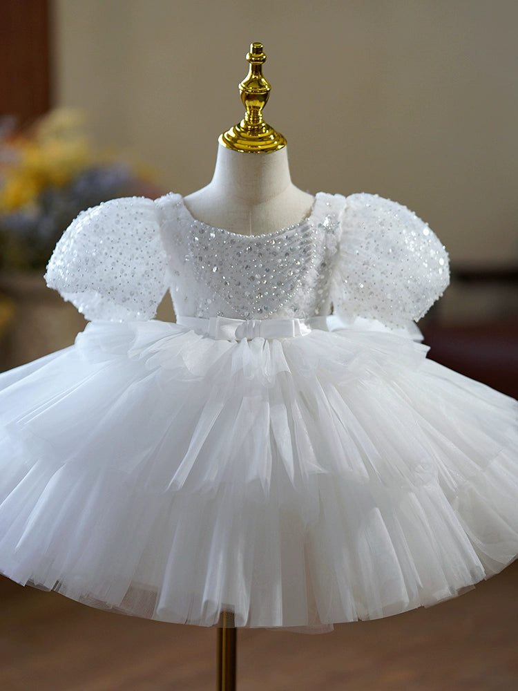 White Sequin Tulle A-Line Flower Girl Dress with Puff Sleeves