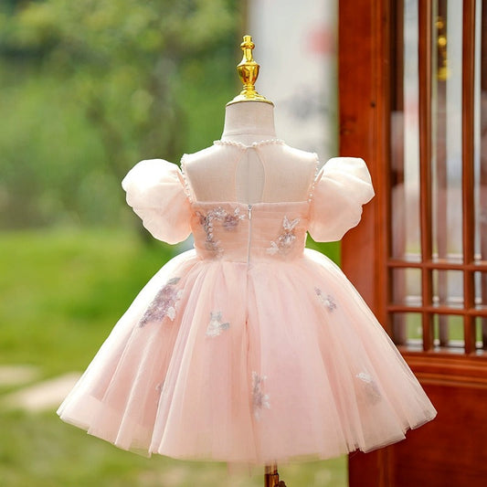 Elegant Pink Tulle Flower Girl Dress with Lace & Puff Sleeves