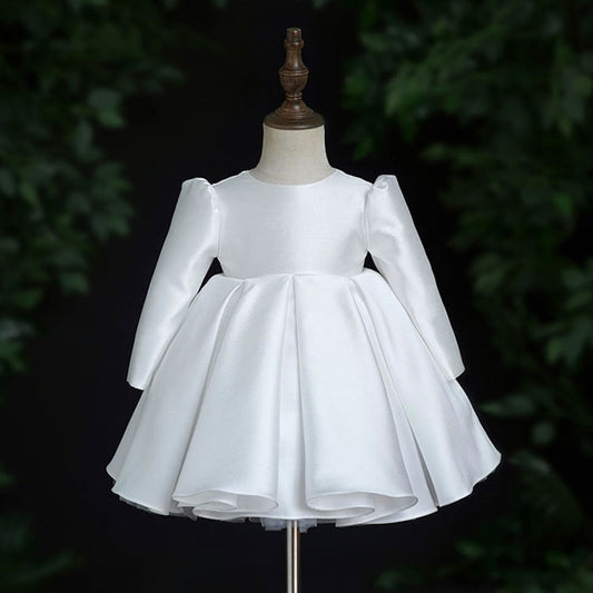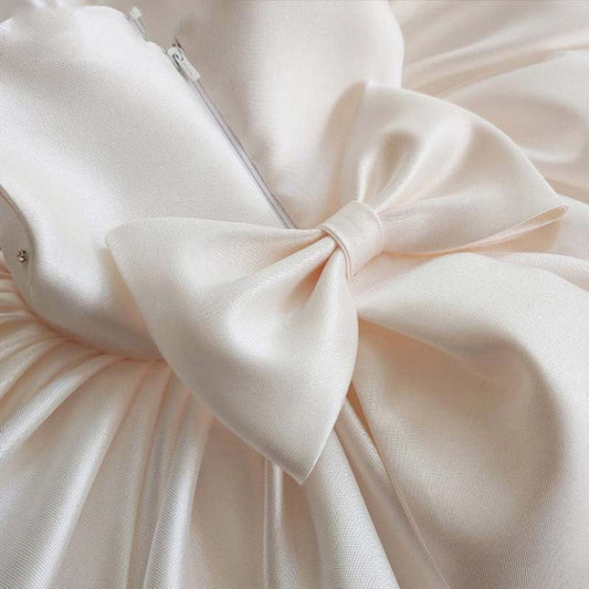 Elegant White Satin Flower Girl Dress with Bow & Beaded Details