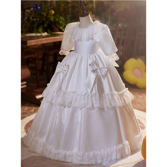 Elegant White Princess Dress for Girls with Bows and Tiered Skirt