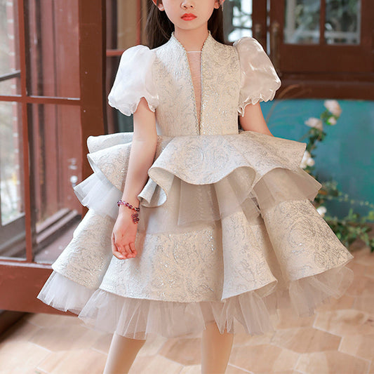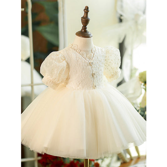 Ivory Lace Tulle Princess Flower Girl Dress V-Neck Puff Sleeve