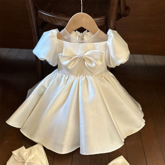 Knee-Length Satin Flower Girl Dress with Puff Sleeves and Bow