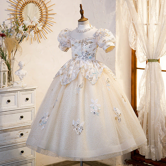 Ivory Sequined A-Line Flower Girl Dress with Puff Sleeves