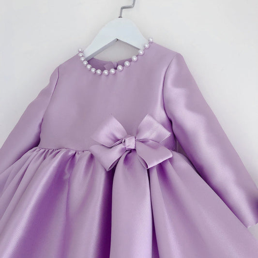 Lavender A-Line Satin Flower Girl Dress with Pearls and Bow