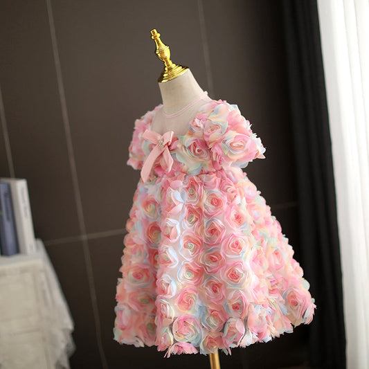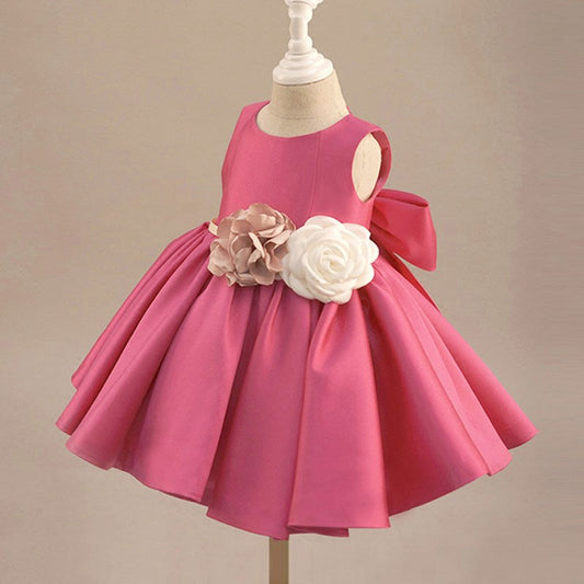 Pink Princess Flower Girl Dress with Flowers and Bow Back