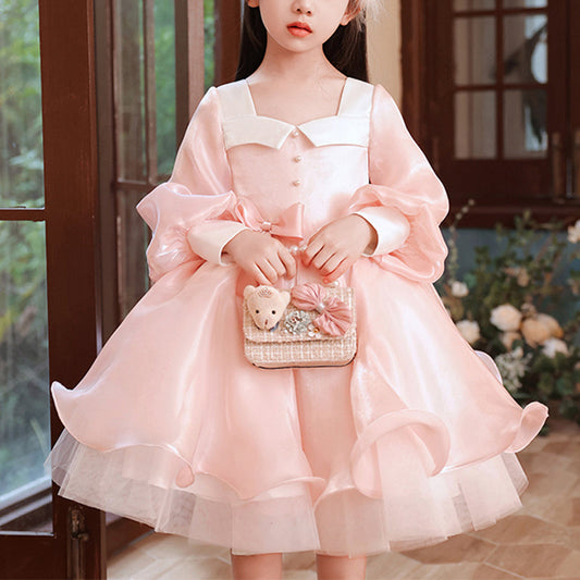 Pink Princess Flower Girl Dress with Organza Puff Sleeves
