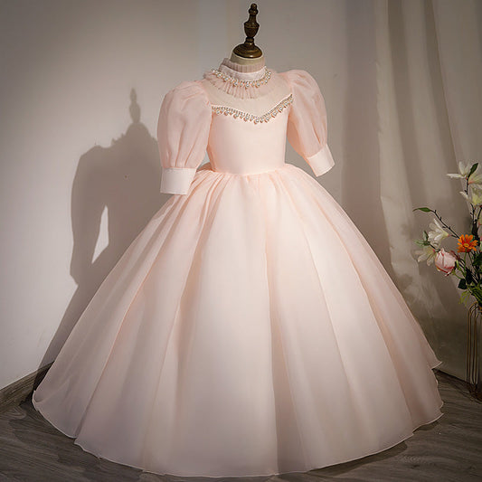 Pink Organza Princess Flower Girl Dress Beaded Mock Neck