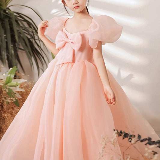 Pink Organza Princess Flower Girl Dress: Puff Sleeves Bow