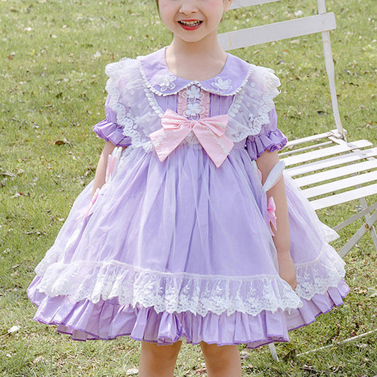 Princess Lace Flower Girl Dress with Bow Tea Length Short Sleeve