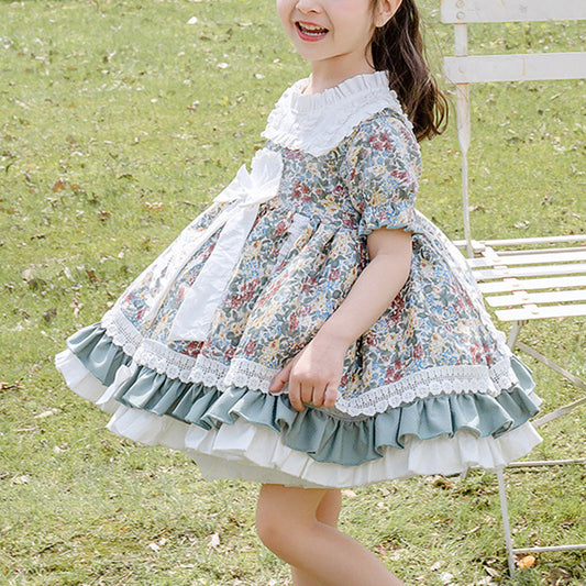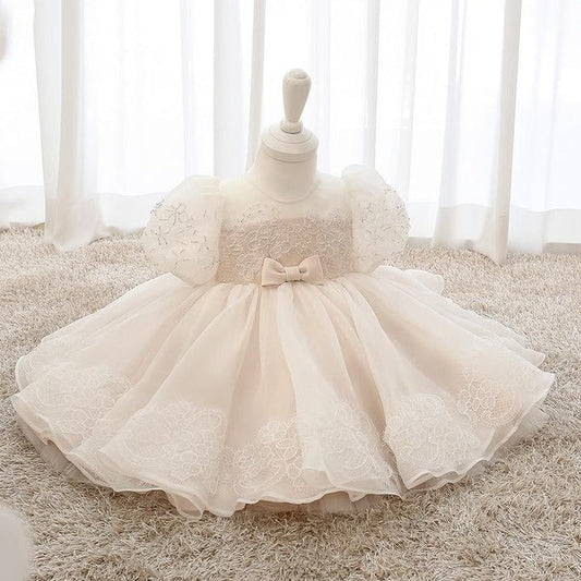 Princess Lace Flower Girl Dress with Puff Sleeves & Bows