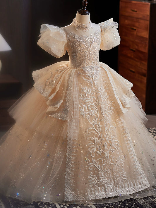 Princess Mock Neck Floor Length Organza Flower Girl Dress in Champagne