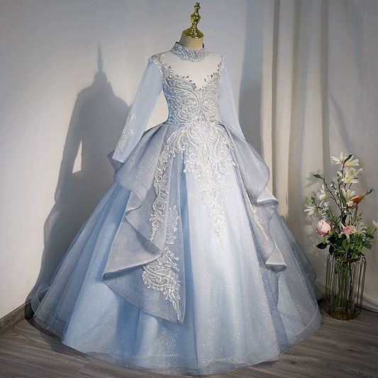 Princess Mock Neck Floor Length Tulle Flower Girl Dress in Dusty Blue