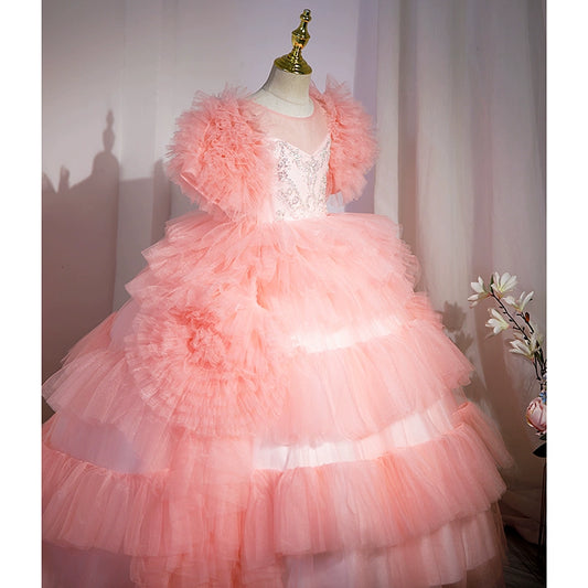 Princess Round Floor Length Organza Flower Girl Dress in Pink
