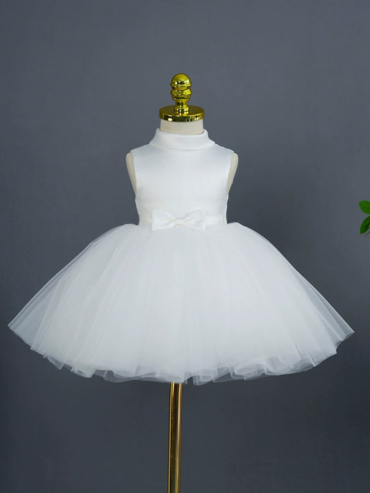 Princess Mock Neck Tea Length Satin Flower Girl Dress in White