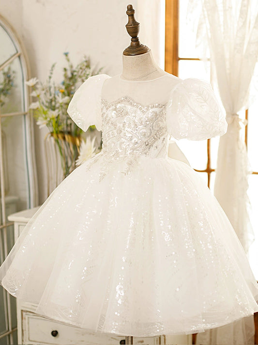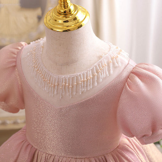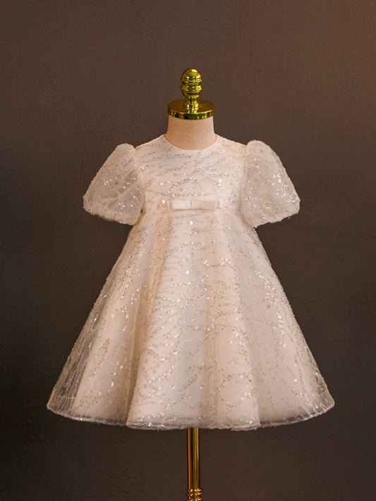 Princess Satin Flower Girl Dress with Puff Sleeves & Beaded Ruffles