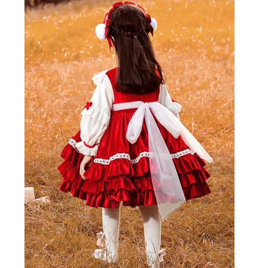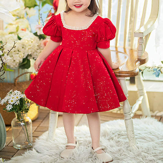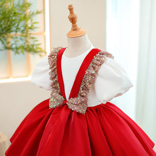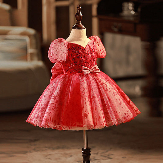 Red Sequin Princess Flower Girl Dress V-Neck Puff Sleeve Bow