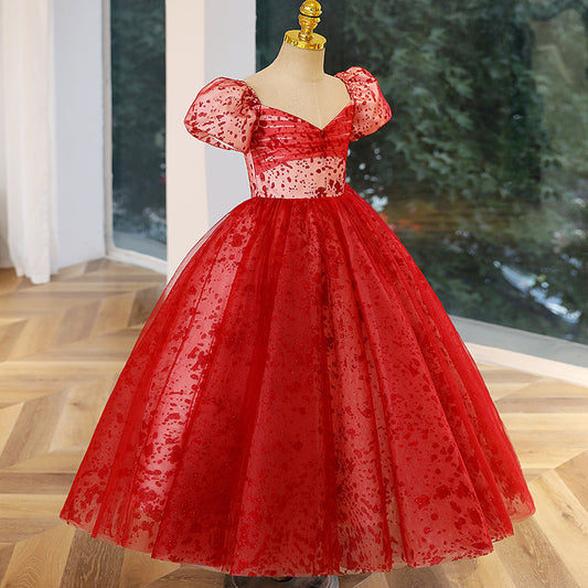 Red Tulle Princess Flower Girl Dress Sequin Pleated Puff Sleeve
