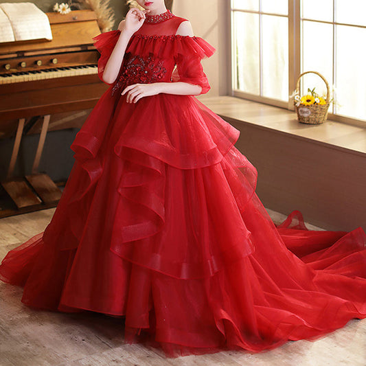 Red Tulle Sequin Ball Gown Dress for Girls - Floor Length Tiered Skirt