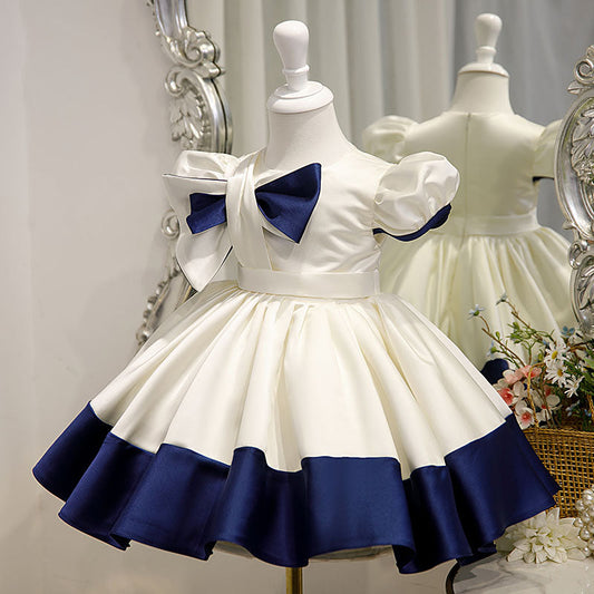 Royal Blue Satin Flower Girl Dress | Bow & Ruffle