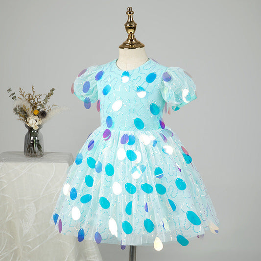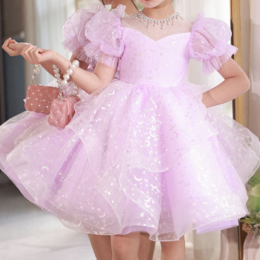 Sequin Tiered Ball Gown Dress for Girls - Short Sleeve, Knee Length