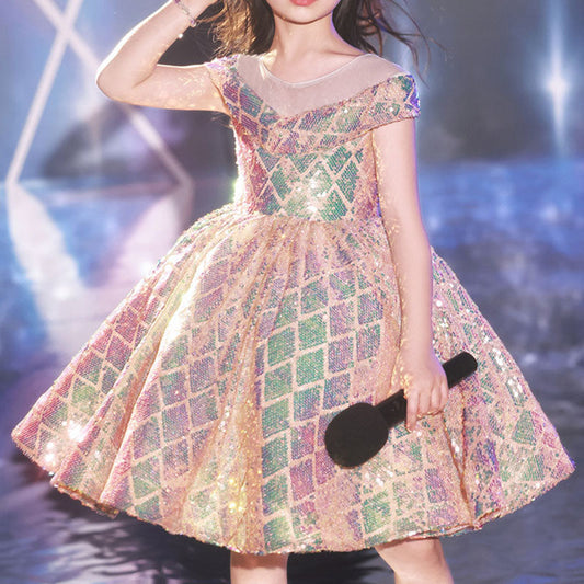 Sequin Ball Gown V-Neck Sleeveless Knee Length Dress for Girls