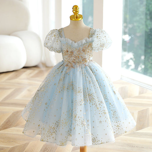 Sequin Princess Flower Girl Dress Lace Flower V-Neck Puff Tea