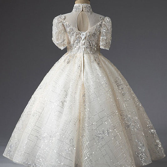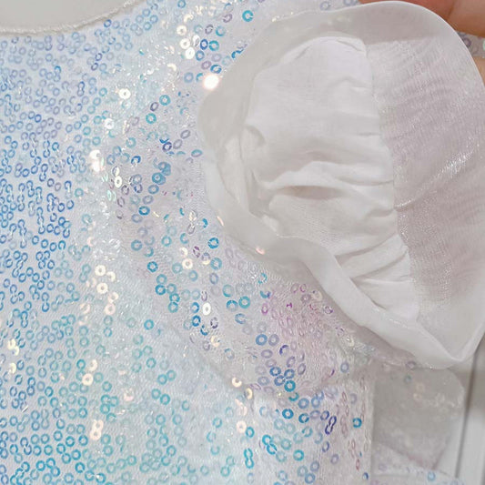 Shiny White Sequined Princess Dress for Girls - Tiered Skirt & Short Sleeves