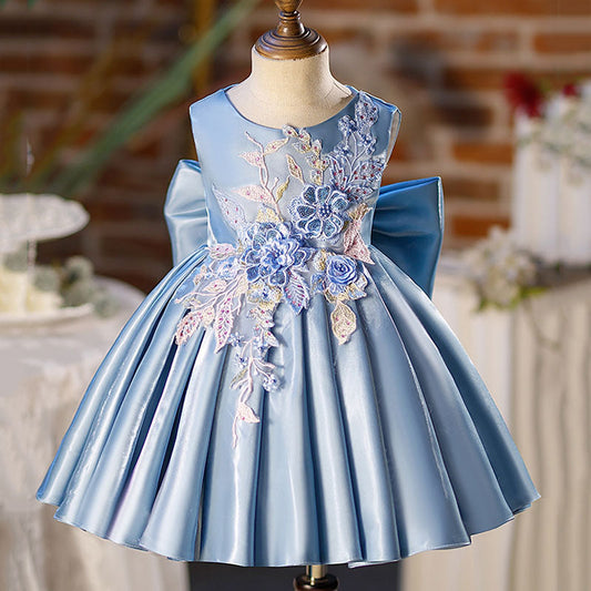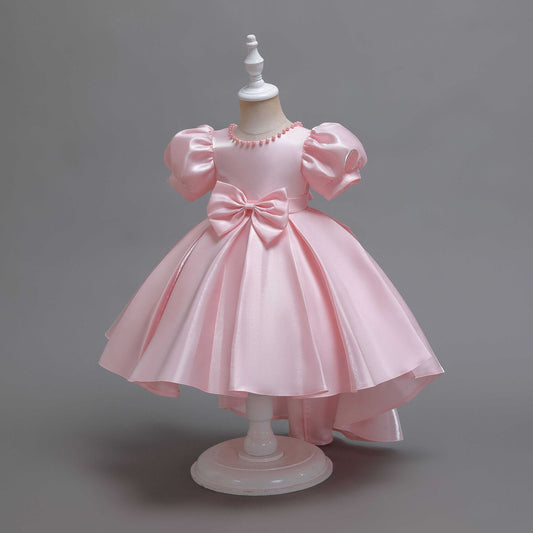 Short Sleeve Princess Tea Length Satin Dress with Bow for Girls