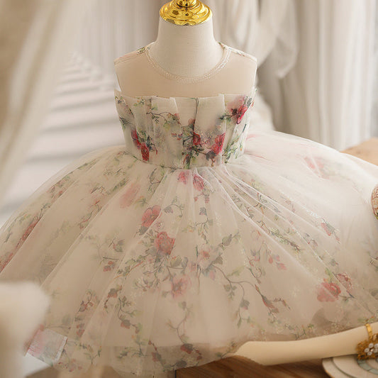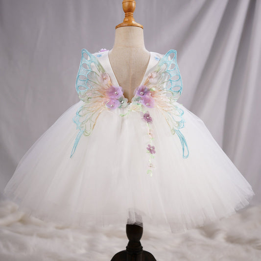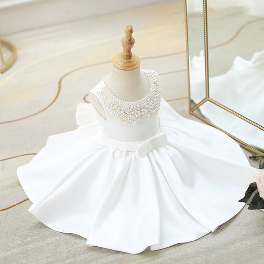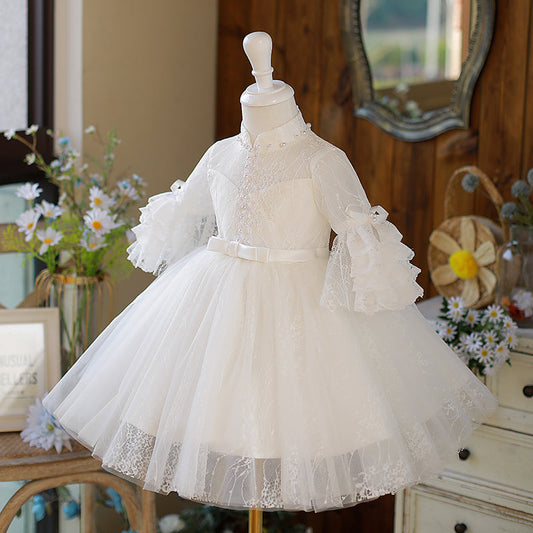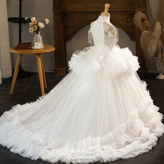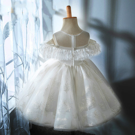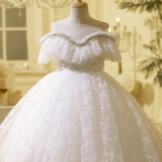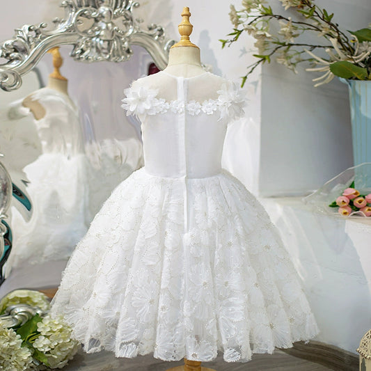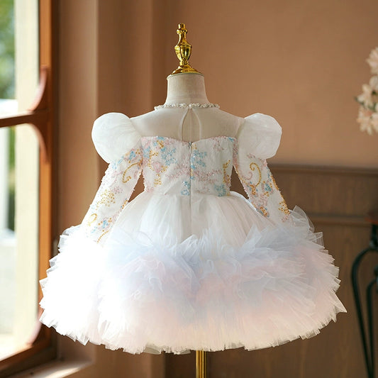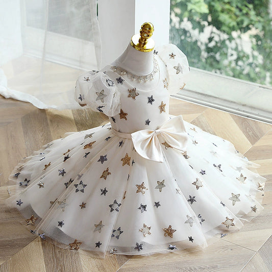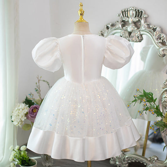 White Fluffy Princess Dress with Sequin Bow and Embroidery for Baby Girls