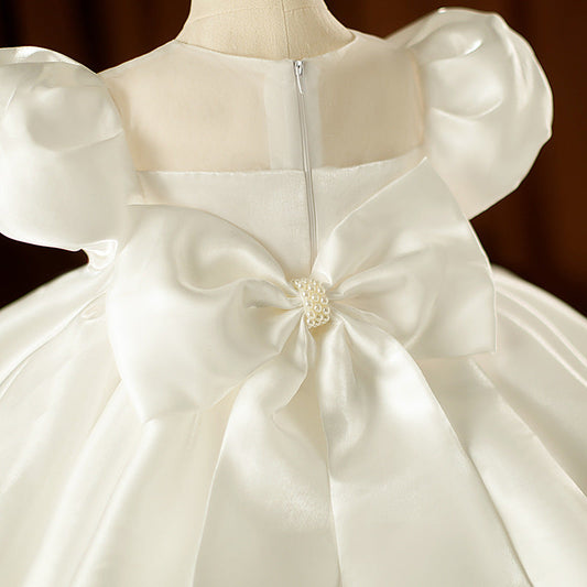 White A-Line Flower Girl Dress with Beaded Bow & Puff Sleeves