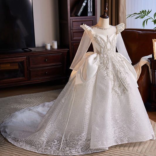 White Ivory Princess Flower Girl Dress with Lace and Sweep Train